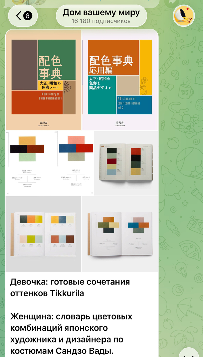 В моем тг-канале "Дом вашему миру" оставила ссылку на онлайн-версию этого словаря, где можно подсмотреть больше 300 готовых комбинаций цветов для интерьера.