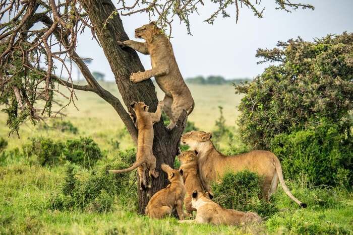 Хотя львы не славятся умением лазать по деревьям, эти львята не смогли устоять перед желанием проверить свои способности. В юном возрасте львам ещё относительно легко карабкаться по стволу, но по мере того, как они увеличиваются в размерах, лазание становится всё более трудным. Несмотря на эти ограничения, некоторые львиные прайды научились искусно взбираться на деревья и проводят большую часть времени, сидя на ветвях, где они могут укрыться от дневной жары.