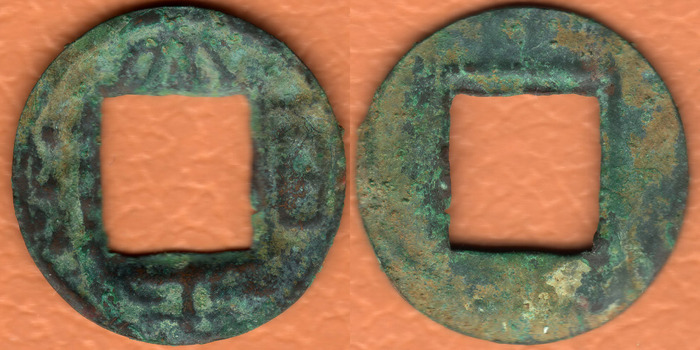 100 монет учжу 214 – 234 годов (19 год Цзяньань – 12 год Цзяньсин / 建安19年–建興12年), отлита в правление Чжаоле-ди Лю Бэя (Zhāolièdì Liú Bèi 昭烈帝劉備) и Хуай-ди Лю Шаня (Huáidì Líu Shàn 懷帝劉禪).