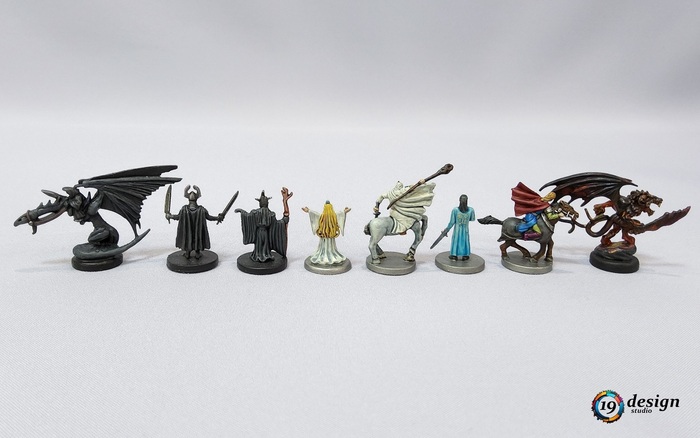 Это обозначено цветами подставок - белым и серым. Обычно я раскрашиваю подставки для героев Войны Кольца в серебро, но здесь меня попросили раскрасить вот так
