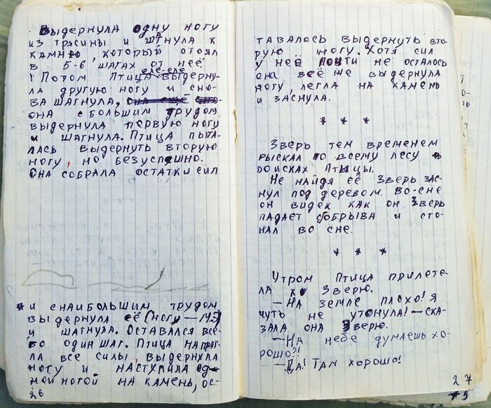 Сразу предупреждаю, что творчество десятилетнего автора не содержит никакой литературной ценности.)) На страницах можно увидеть помарки, ошибки и исправления. Я был молод и не знал сомнений, поэтому писал без черновиков, сразу в книжку )) Есть исправления красной пастой, но это, возможно, сделал кто-то из читателей-одноклассников, более прокачанный в грамоте.