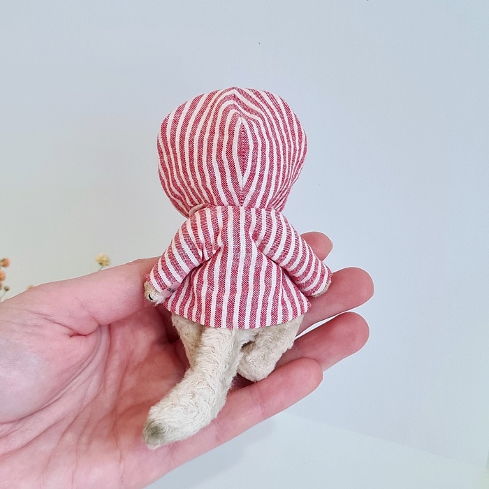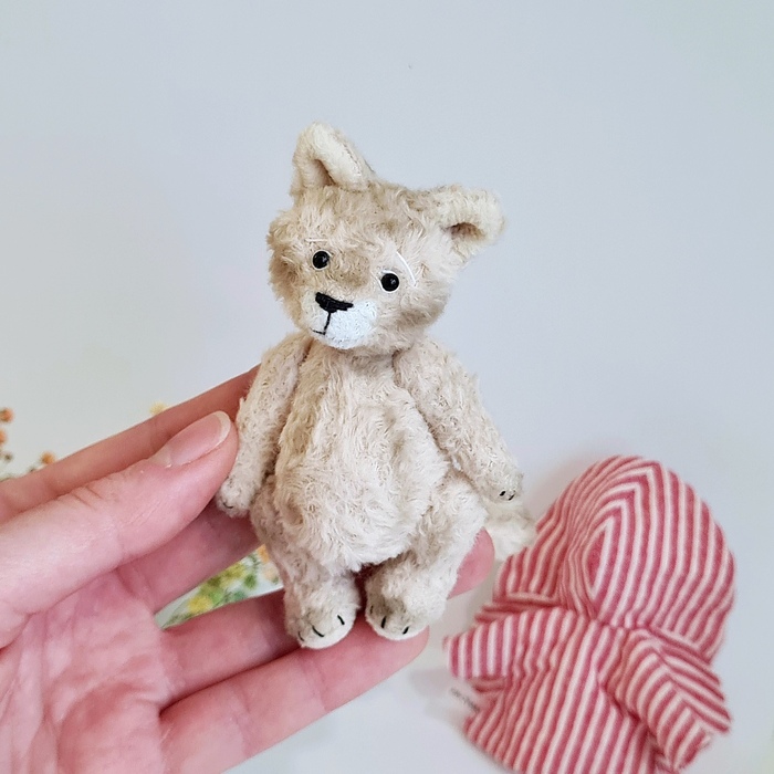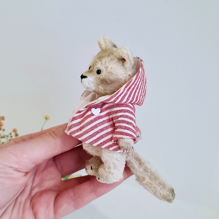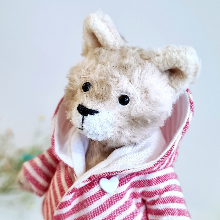 Сшит из вискозы, набит кедровыми и можжевеловые и опилками. А в пузике ещё стеклянные гранулы, чтобы был хотя бы чуть-чуть потяжелее, а то совсем как пушинка. Глазки стеклянные. Ручки, ножки, голова- всё крутится.