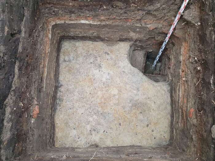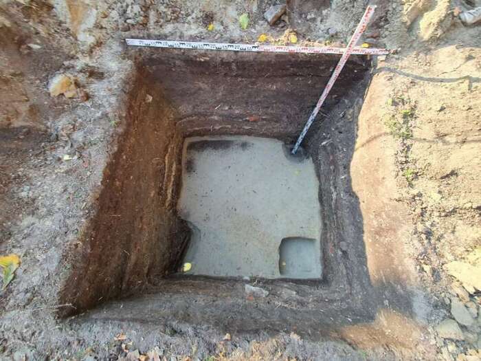 Слои идут разные и интересные, виден мусор, внизу вроде материк... А что в верхнем правом углу? Какой-то ящик и... А дальше хрен кто шурф в ту сторону увеличил!