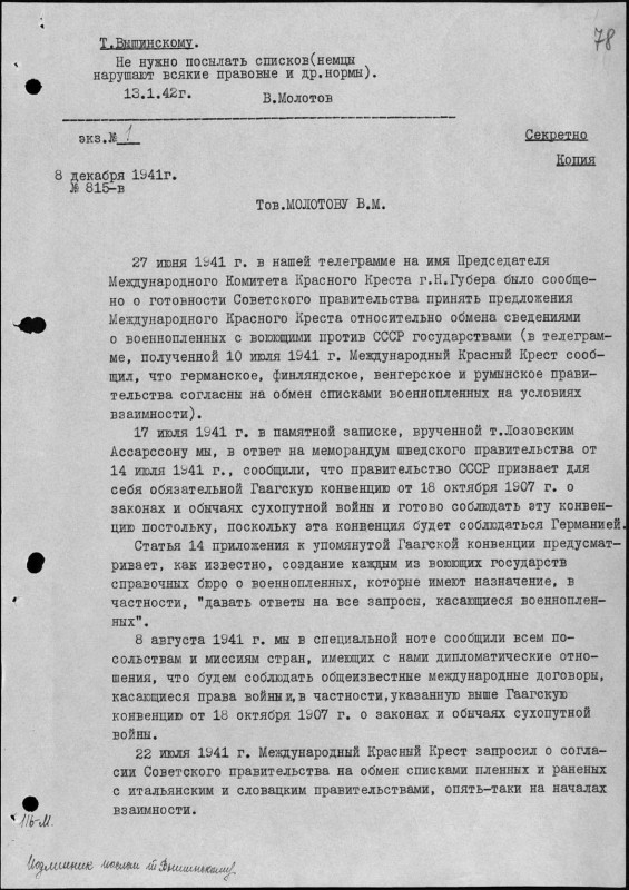 27 июня 1941 нарком иностранных дел В.М.Молотов от имени Советского правительства заявил о согласии с предложением «Международного комитета Красного Креста относительно представления сведений о военнопленных, если такие же сведения будут предоставлены воюющими с советским государством странами»