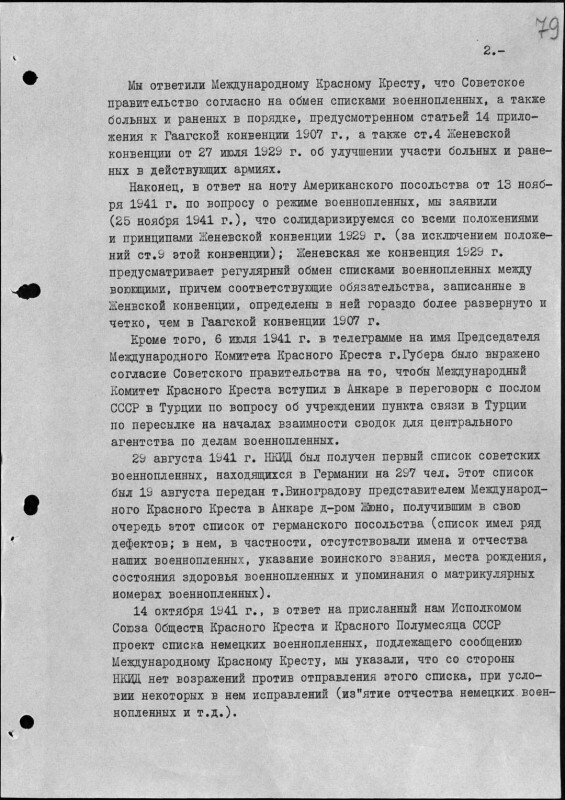 Несколькими днями позже 25 ноября 1941 г. поверенный в делах США в СССР У. Торстон передал в Народный комиссариат иностранных дел СССР письменное сообщение Госдепартамента с предложением о выступлении Советского Союза с декларацией о согласии применять статьи 1-88 Женевской конвенции о военнопленных.