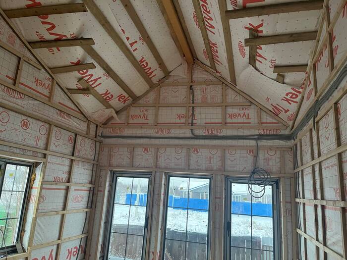 Причём, не абы какие тряпочки с рынка, а крутейшие плёнки компании Dupont, которые являются фактическим стандартом американского каркасостроения. То, что мы наблюдаем изнутри супердиффузионная мембрана Tyvek Soft стоимостью 15 000 рублей за рулон.