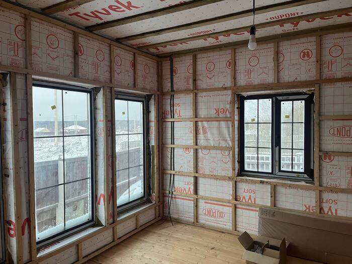 Снаружи стены, судя по серебристому напылению и текстуре, установлена пароизоляция Tyvek AirGuard Reflective — нынче стоит примерно 30 000 рублей за рулон.