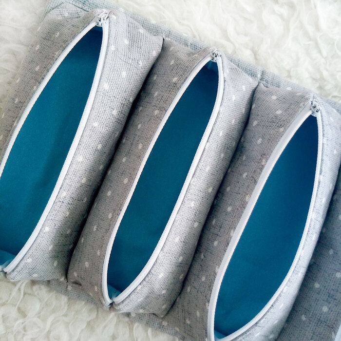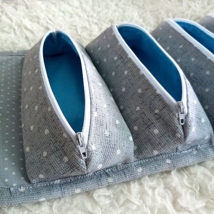 Наружная часть косметички сшита из хлопчатобумажной рогожки, внутри — полулен и бязь. Уплотнена флизелином.