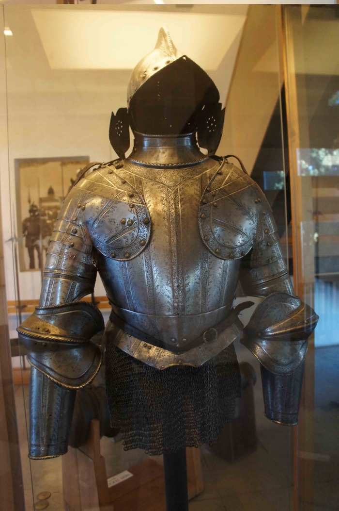 Обратите внимание, что область вокруг живота сегментирована, чтобы обеспечить лучшую подвижность в нижней части талии. Шлем в турецком стиле, вероятно, изготовленный в Праге, является более ранней работой.