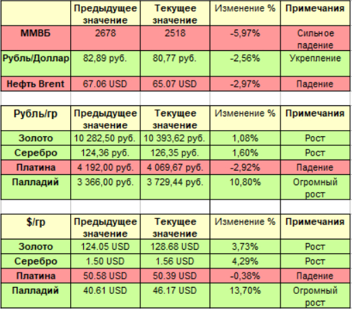 Точная информация по изменению индекса за неделю выйдет в понедельник в отчётах за неделю по движению индекса ММВБ, пары рубль/доллар, нефти Брент и 4 драгметаллов.