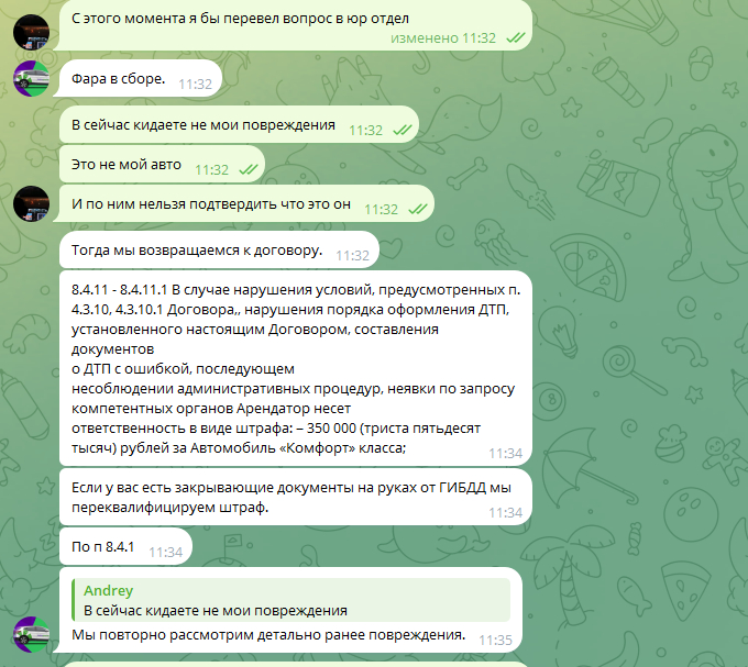 НУ И вечером мне ситидрайв выставляет штраф в приложение и в откровенно грубоватой форме начинает написывать сотрудник Ситидрайв некто "Андрей Андреевич", говоря что я ПОКИНУЛ ДТП, не сообщил в компанию и не вызвал ГИБДД.