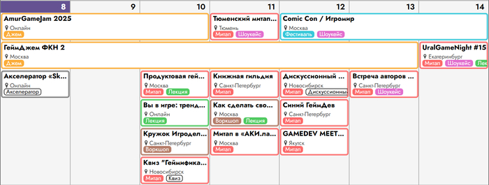 Календарь Дайджест Онлайн Москва Новосибирск Санкт-Петербург Тюмень Якутск Екатеринбург Краснодар Акселератор Митап Лекция Workshop Фестиваль Конференция Telegram (ссылка) ВКонтакте (ссылка) Длиннопост