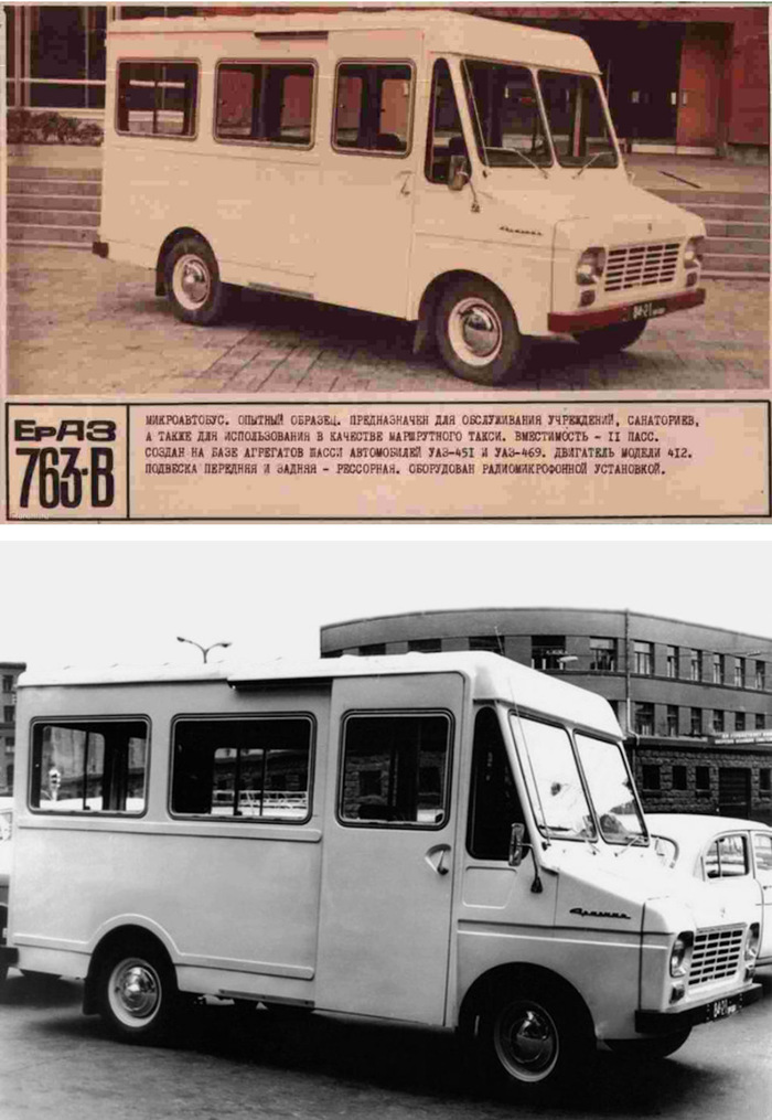 Уже в 1967 году по техническим условиям, сформулированным специалистами НИИАТ, был создан опытный образец, получивший индекс — EpAЗ-763. Радикальным новшеством конструкции стала рама. На нее крепилась бескапотная кабина, внешне напоминавшая серийные РАФы и ЕрАЗы, а позади кабины устанавливалась полноценная жесткая цельнометаллическая «будка», превосходившая кабину как по ширине, так и по высоте