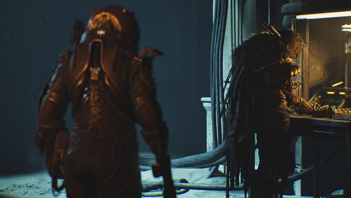 И мы смело движемся вперёд, находим труп предшественника и принимаем его задачу – экстракцию сознания нужного человека в прошлом. Она проходит нормально, а вот дальше начинаются странности – устройство для Вознесения (процедуры передачи сущности извлечённого Коллективу) не работает, появляется Смотритель – специалист Коллектива, призванный, собственно, следить за работой механизмов оного, чинить экипировку Путников и т.п.