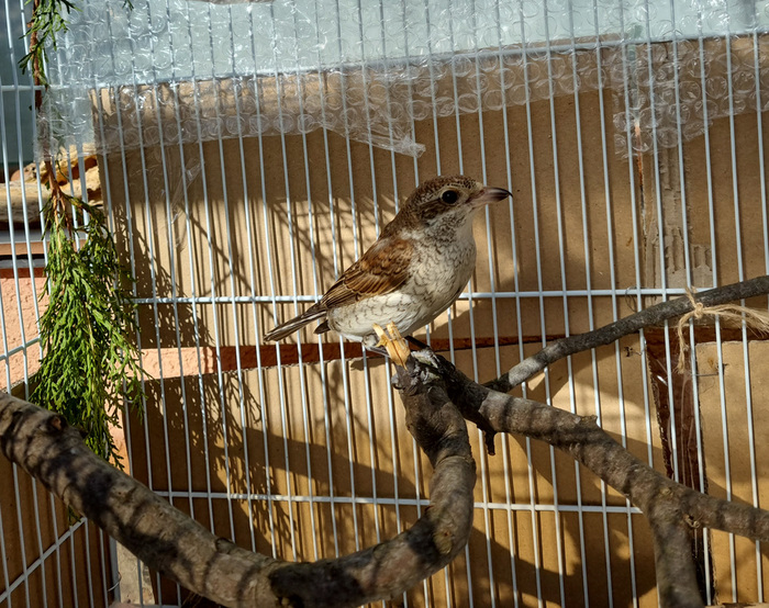 При беглом осмотре выяснилось, что у птицы отсутствует хвост, чуть подвисает крыло и прищурен один глаз. Посадила на первое время в кошачью переноску. Полезла читать, что делать дальше. Птица оказалась вроде как насекомоядной, но вообще жрущей все, что сможет поймать и убить (и живописно нанизать на шип) – и мелких птичек, и мышек, и ящерок. Наловила ей немного насекомых, отрезала кусочек индюка, т.к. ничего другого не было. В местной ветеринарке мне предложили антибиотик для голубей (так-то антибиотик нужен после укуса кошки) и капли для глаз, а саму птицу даже смотреть не стали – не их профиль. Девать мне ее было некуда, приютов для птиц в городе нет, РЦ где-то в стране есть, но далеко и не факт, что возьмут не краснокнижника. Ладно, думаю, полечу чем есть, подожду пока отрастет хвост и отпущу, если, конечно, не помрет.
