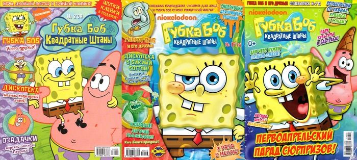 Российский ежемесячный детский журнал по мультсериалу «Губка Боб Квадратные Штаны». Каждый выпуск содержал адаптированные комиксы, головоломки, настольные игры, уроки рисования и постеры, погружая читателей в юмористический подводный мир Бикини-Боттом.
