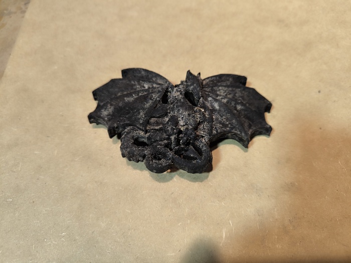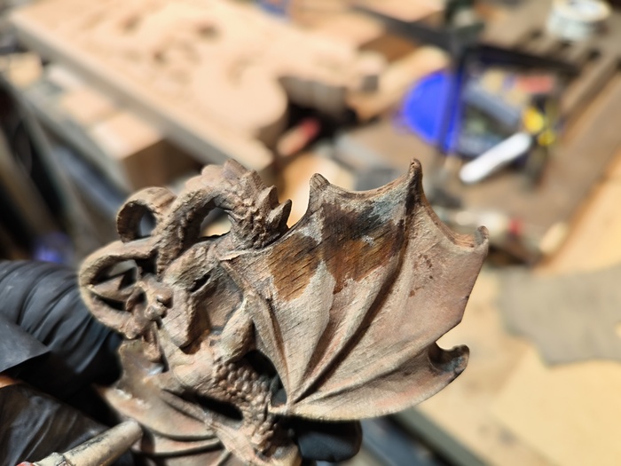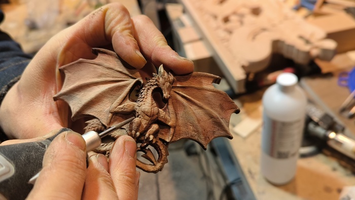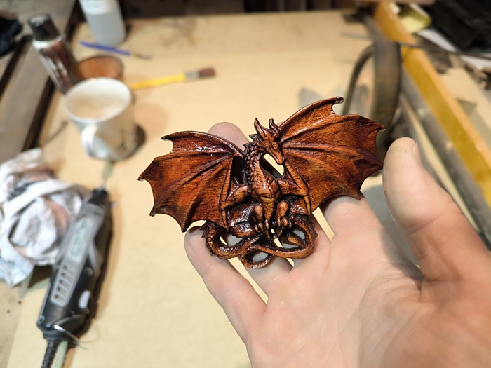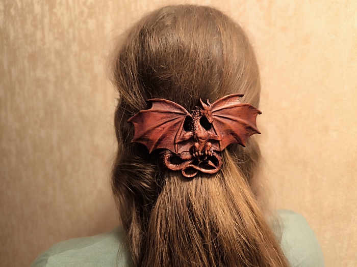 Затем - сжатый воздух. Он выдувает оставшийся пепел и воду из пор. Виверна сделана из бука - он впитал много воды и теперь, когда воздух проходит сквозь заколку - из сосудов идут пузыри.