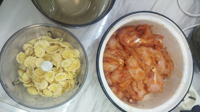 kitchen.hacking Серия Закуски, салаты, перекусы Домашние куриные наггитсы 1 час назад Категория: #закуски #детям Кухня: #Американская Ингредиенты: Куриное филе - 1 кгЯйцо - 1 шт.Приправа для курицаКукурузные хлопья - упаковка 150 гр.Масло (если фритюр, то в зависимости от чаши. Можно аэрогриль, будет менее жирно). Приготовление: Кукурузные хлопья перемолоть, добавить специи и соль.Куриное филе нарезать на небольшие кусочки. Обвалять курицу во взбитом вилкой яйце, далее в сухой смеси. 4. Жарить во фритюре или аэрогриле до готовности. 5. Подавать с соусом, например тар-тар. Показать полностью 3 [моё] Рецепт Закуска Мужская кулинария Фритюр Аэрогриль Ещё 0