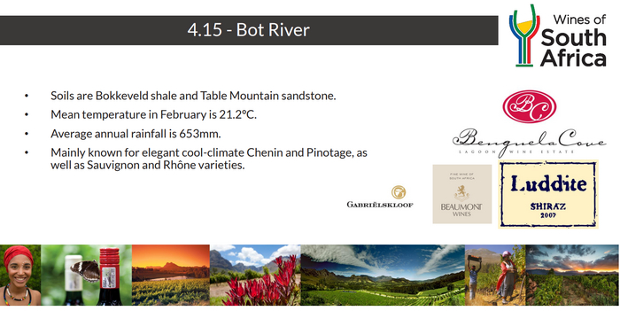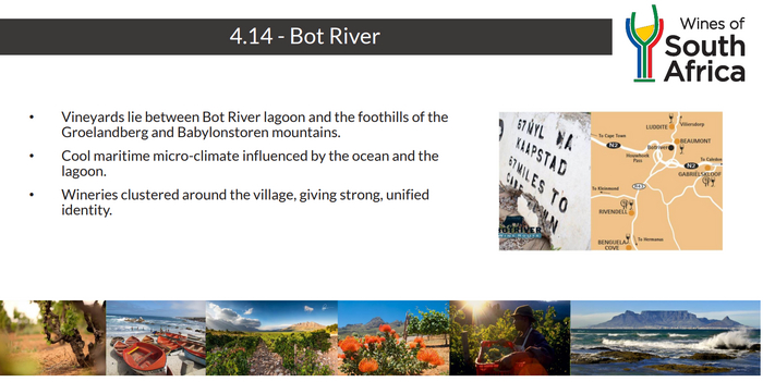 • Виноградники расположены между лагуной Бот-Ривер и горами Грунеландберг и Бабилонсторен.