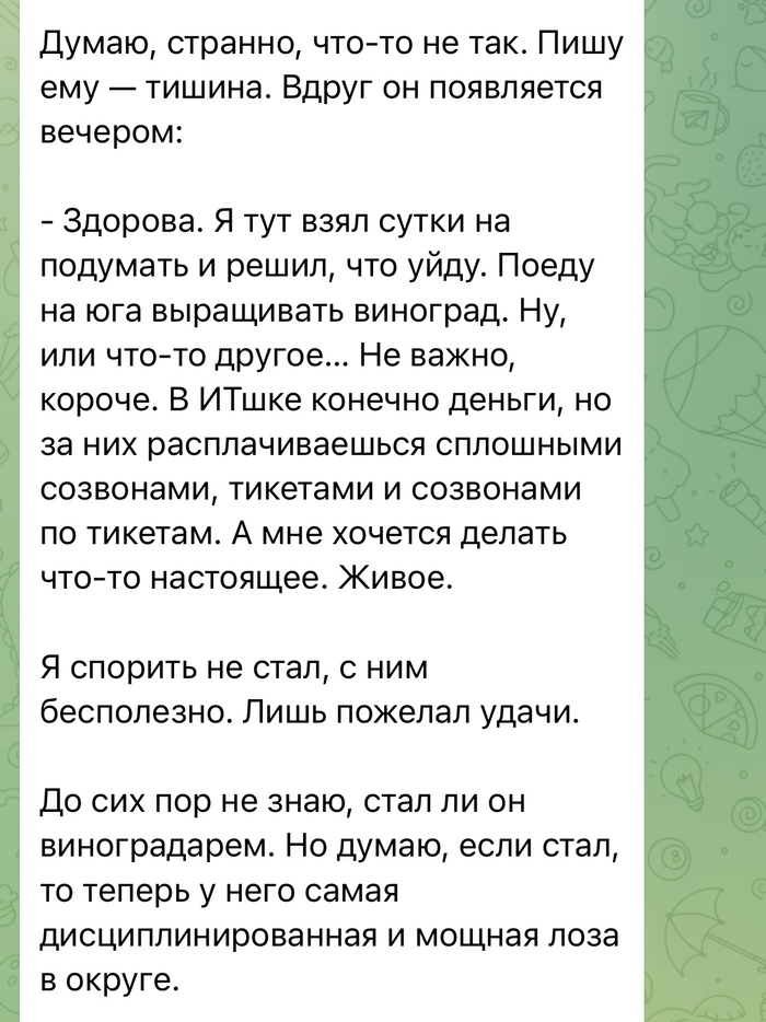 Родители со временем состарились, мы с братом выросли. Однажды отец сказал, что больше не может работать, силы уже не те. И потом скоропостижно скончался, царство ему небесное. Но матушка не пустила картошечное дело на самотёк, мы с братом стали её рабсилой. Один год выезжала с нами, и гоняла нас. Через год и она ослабла. Решила руководить нами из дома. Но тут я уже сказал своё твёрдое "нет". Брат присоединился ко мне.