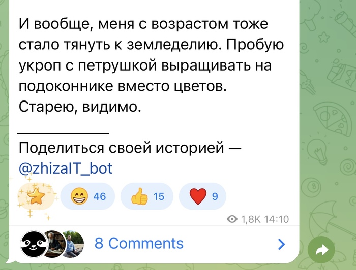 У родителей было два участка, небольших, десять и двенадцать соток. На одном был яблоневый сад, малина, груши, абрикос, черешня, смородина, крыжовник. На другом сажали... угадайте, что? Ясень перец, картоху, будь она неладна. Сажали примерно шесть мешков семенного материала, опрыскивали, окучивали, пололи, и выкапывали... угадайте, сколько? Шесть, ну семь мешков картошки. Но уже вперемешку, большую и маленькую. Тратили на это уйму времени, жгли бензин в поездках. Почвы у нас глинистые, картошке на ней расти тяжело, она любит песчаники. Культивировать её не было смысла. Но родителям, выросшим в деревне, сама мысль о том, что земля может пустовать, была неприемлема.