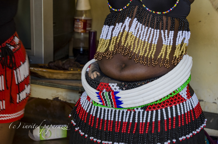 Вот те обручи на талии девушки: там, где европейка изо всех сил утягивала бы себя, зулу девушки добавляют объёма. Обручи эти – пучки травы, переплетённые пальмовым листом и украшенные бисером, они "навешиваются" на традиционную юбку из коровьей шкуры.