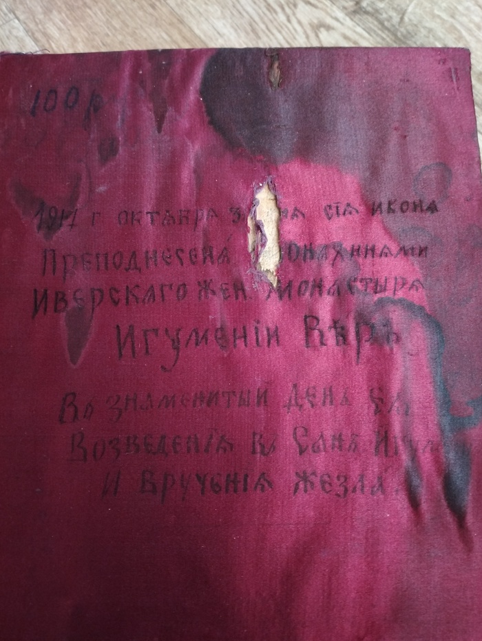 Как -то заехал к теще на блины ,и за разговором она мне показала семейную икону в киоте.Выдав при этом, интересную историю о том,что одна из бабок была игуменьей Иверского монастыря в Самаре ,а икона -одна из тех,что монахини спасали от большевиков ,когда разрушали монастырь. Икона в киоте,открутил винты ,достал ...шикарное состояние ,оклад серебро 84пр.,сусальное золото,а сзади та самая запись.Далее ,гугл в помощь ,сайт монастыря ,история от основания до 1917 года,а далее ..нет такой такой игуменьи и не было в их списках, или все -таки 17 год внес свою лепту. Теща рассказывала ,что монахини спасли самые ценные иконы и вещи ,а потом прятались от Советской власти.