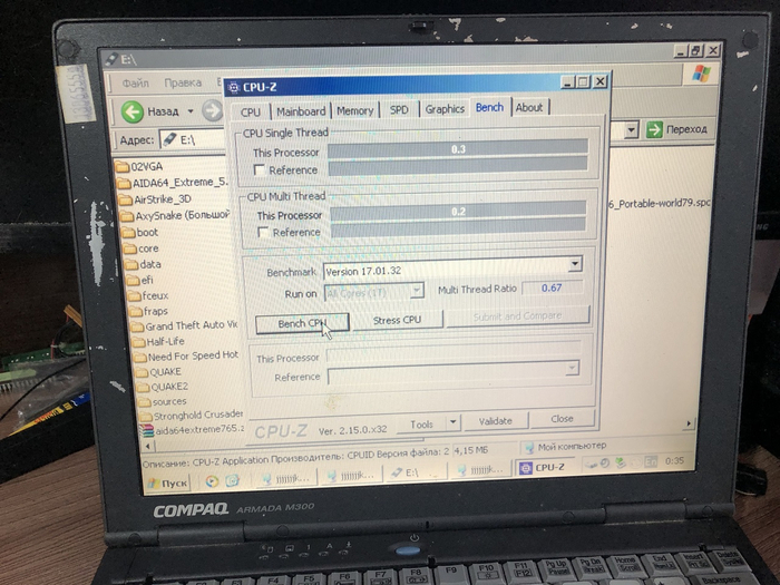 После загрузки Windows XP, я решил запустить CPU-Z от марта 2025 года. Процессор набрал всего 0.3 и 0.2 очка в бенчмарках однопоточных и многопоточных вычислений... Ну, не шибко конечно, но здесь попугаи считаются относительно куда более современных процессоров.