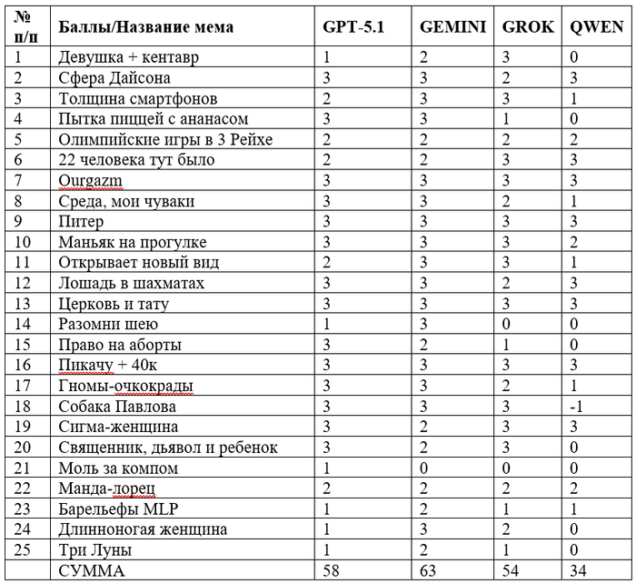 Итог анализа: Видимо мем относительно новый, поскольку только GPT-5.1 смогла объяснить, что это перерисованный мем, но почти (GROK увидел тут детские игрушки и танки) все остальные уловили суть правильно, поэтому получают заслуженные баллы.