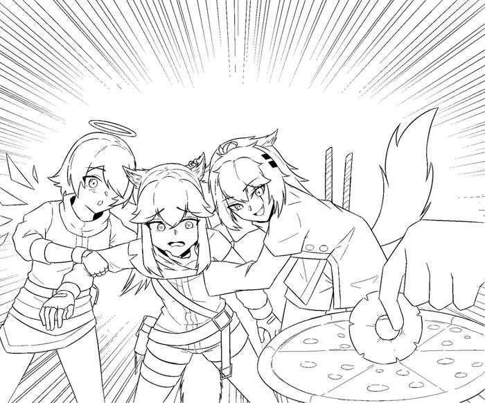 "Этот мем — это классический пример «Пицца-войны» (или «Битвы за пиццу») в аниме/мanga стиле, где персонажи сражаются за кусок пиццы, как за что-то бесценное."