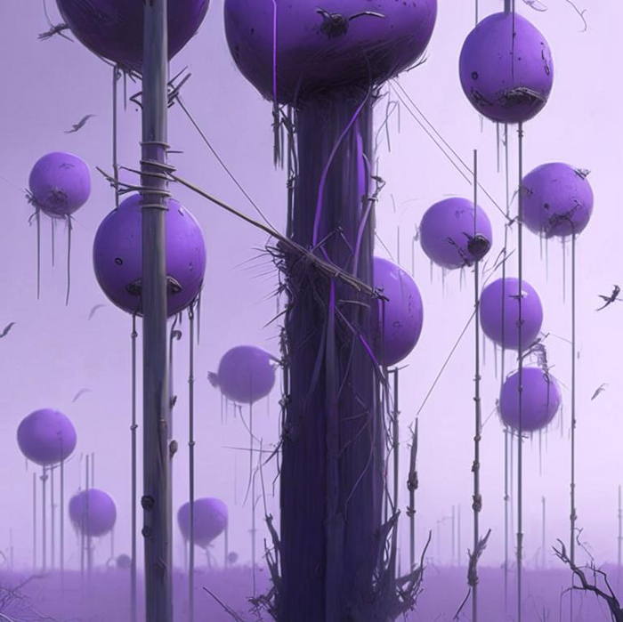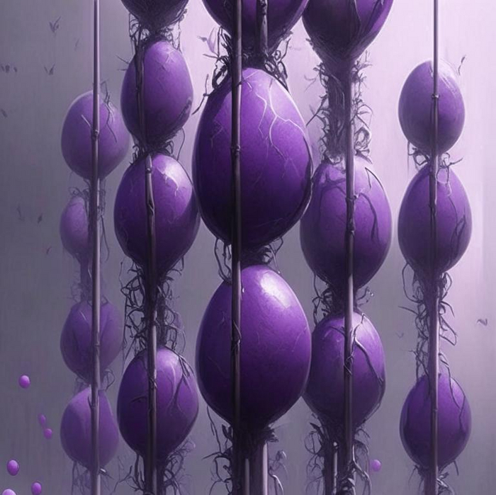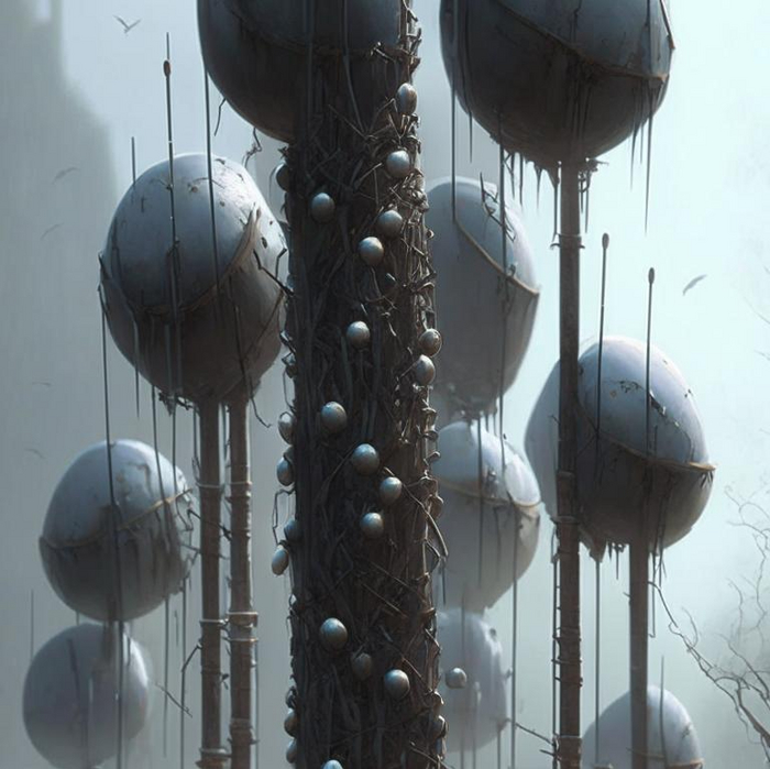 Из тумана вырастал странный и таинственный лес, состоящий из длинных фиолетовых суставчатых жердей толщиной в руку человека. Верхушка каждой жерди расщеплялась на пучок тонких прутьев, похожих на нечто вроде веника или гнезда, внутри которого прятался отсвечивающий металлом и слюдой кокон. Жерди отстояли друг от друга метров на двадцать, но их было много, и «лес» – из них издали казался густым и сухим, словно то было поле сгоревшего камыша или бамбуковых побегов.
