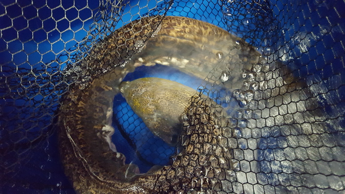 На рыбке - мастере маскировки, ловко прячется какой-то огромный паразит! Мы немедленно удалили самозванца и стали изучать. По правде говоря, отцепить его от рыбы было не так-то просто - держался он очень крепко. Оцените его размер по сравнению с обыкновенной шариковой ручкой: