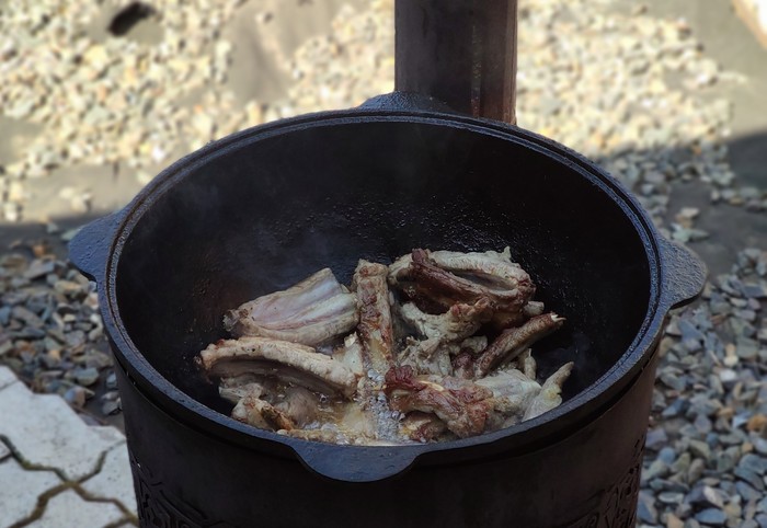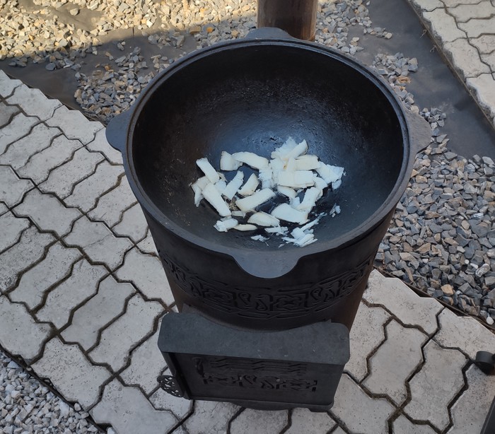 Разжигаем печь/мангал/костер, ставим казан, вливаем все 0,5 подсолнечного масла.
