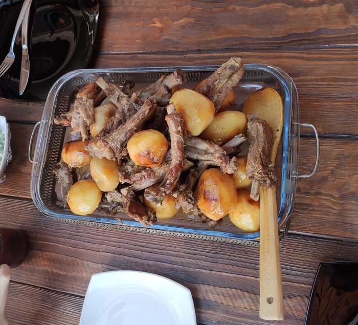 После зажарки в этом курдючном фритюре (звучит странно, если вспомнить на какой части барана этот курдюк находится...) картошку вынимаем и в бой идут поросячьи рёбра, которые поджариваются до приятного цвета (лично мне приятен такой цвет)
