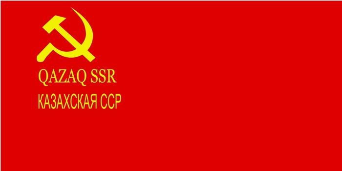 Возвращаемся к 1937-му году. Конституцией Казахской ССР 1937-го года был утверждён флаг: красное полотнище с соотношением длины и ширины, равным 2:1 и золотыми серпом и молотом в верхнем углу у древка, рядом с эмблемой изображалась также золотом русская надпись «Казахская ССР». Название выполнялось и на казахском языке латинскими буквами.