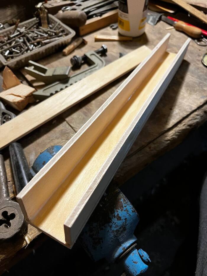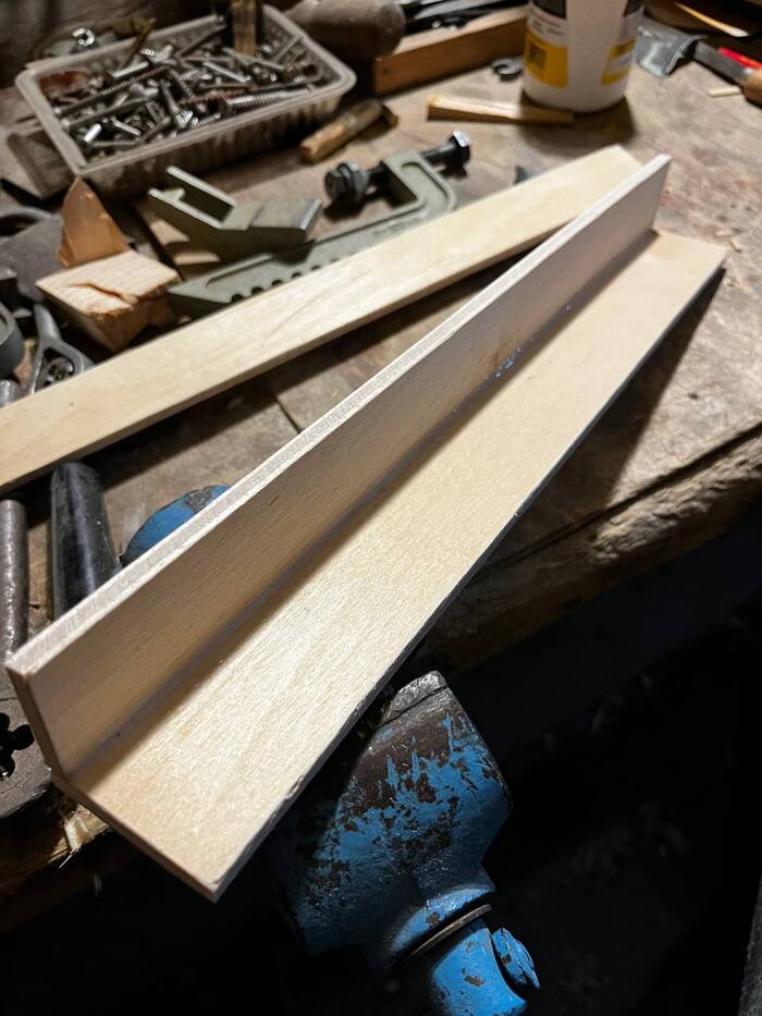 Сперва выпилил фанерные заготовки по длине. Получились прямоугольные куски фанеры с запасом по всем размерам.
