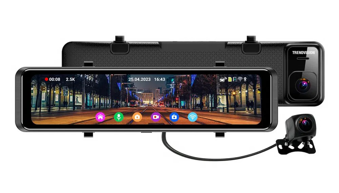 Начнем с форм-фактора зеркал-накладок. EasyDrive 2K Wi-Fi Dual предлагает предельно широкие 170 градусов с фронта и нормальные 120 градусов с тыла. Задний модуль — внешний, а потому логичной функцией является парковочный ассистент. Взаимодействовать с устройством предстоит через 10-дюймовый сенсорный экран с IPS-матрицей.