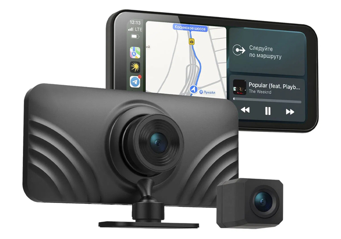 Сенсорный экран весьма крупный, 11,26 дюйма, также конечно же есть контроль по Wi-Fi. Не очень понятно, почему вместо суперконденсатора выбор внезапно пал на литиевую батарею. Впрочем, это не важно, если работает прямое подключение к бортсети — для парковочной съемки. Изюминка модели — внешний модуль GPS/ГЛОНАСС, что полезно в автомобилях с лобовым стеклом с подогревом. Отдельный подключаемый модуль позволяет без проблем установить его в радиопрозрачной зоне.