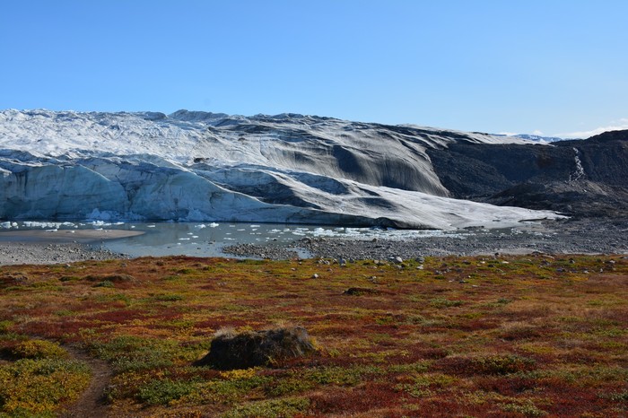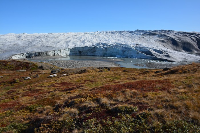 Совсем скоро дорога стала очень тяжёлой, и мы то опускались, то поднимались в горку под уклоном в 30-35%. И вот показался Ice Sheet, бескрайний ледник, заполнивший весь горизонт. Мы припарковались и начали наш поход. Через минут 10 напряжённой ходьбы по камням, оставшимся от растаявшего ледника мы вышли к Ice Sheet. Через 3 минуты я уже шагал по направлению к центру острова Гренландия!
