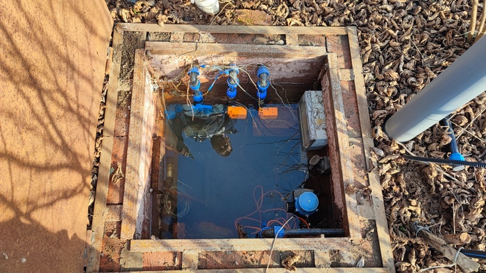 Далее- на моей стороне, в 120см от общего забора (читай по соседской линии полива) вырыт кессон глубиной 80см, в котором скважина, фильтры, гидроаккумулятор и электрическая часть.