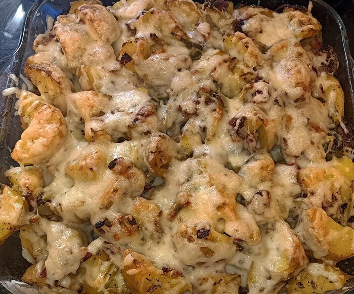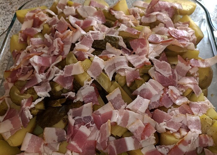 Картофель по-деревенски с беконом и маринованным огурчиком