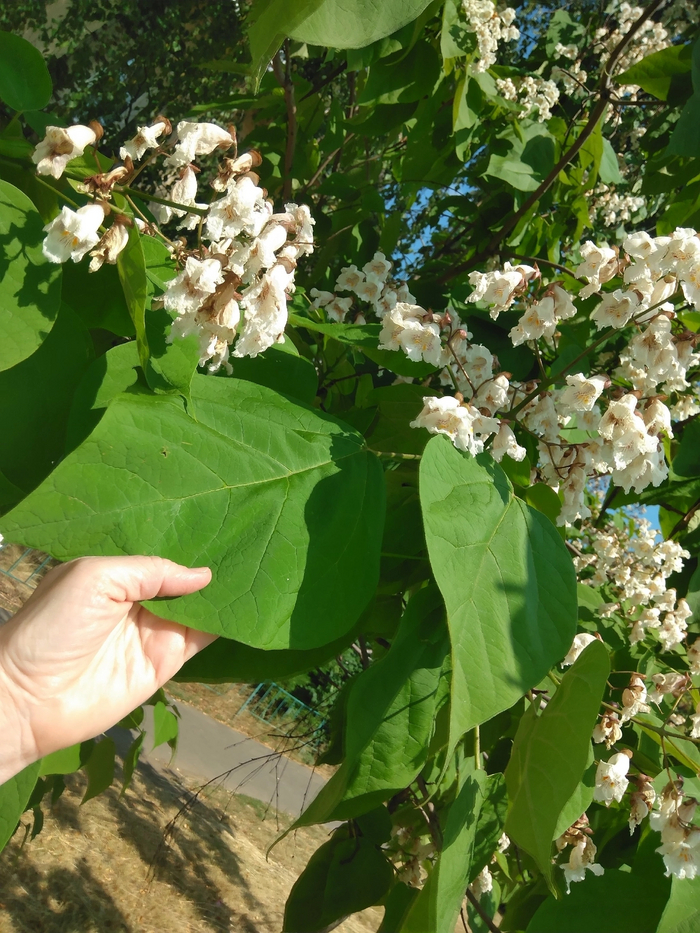 Цветы мне кажутся похожими на маленькие орхидеи, а посмотрите, какие огромные листья! Те соседи уже давно переехали, два деревца были задавлены ремонтной машиной, а остальные три живут...