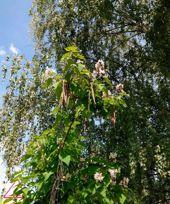 Первые плоды - длинные стручки с семенами остаются висеть до следующей весны и выглядит это мрачновато на листопадных катальпах в нашем городе🥲