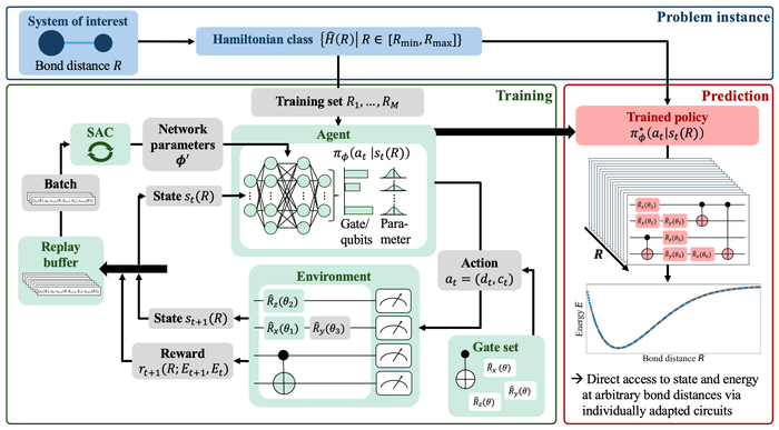 Изучается энергия основного состояния молекулярной системы как функция расстояния между атомами, при этом алгоритм обучения с подкреплением конструирует квантовые схемы с нуля, выбирая гейты и параметры, чтобы предсказывать индивидуально адаптированные схемы для произвольных расстояний и, таким образом, напрямую получать потенциальную энергию и соответствующие волновые функции.