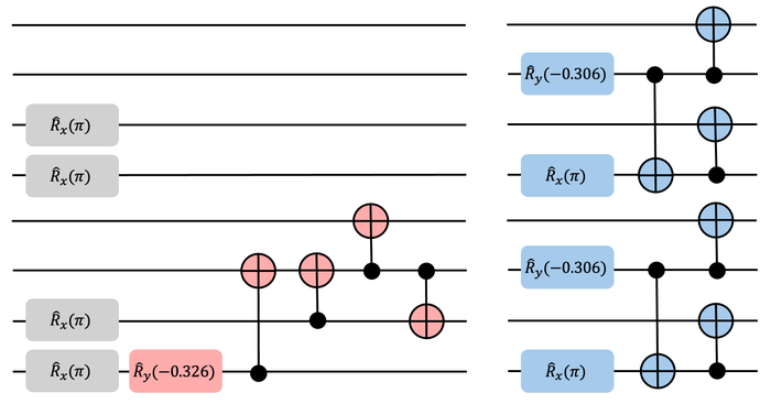 Обученная модель обучения с подкреплением (красный) генерирует структуру, эффективно запутывающую кубиты четыре через семь на всем диапазоне межатомных расстояний, в отличие от стандартного SPA-анзаца (синий), состоящего из двух отдельных блоков запутывания.