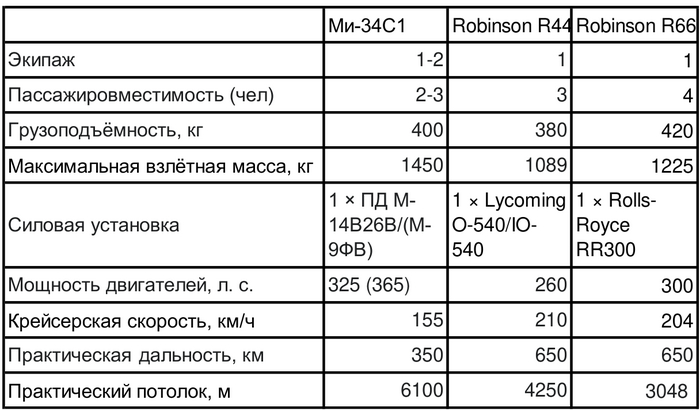 Ми-34 — это замена прежде всего сверхпопулярному в России семейству Robinson (поршневому R44 и газотурбинному R66, суммарно их в РФ около 400), а далее — Airbus Н125, Bell 206, Bell 505, которые в нашей стране представлены штучно. Поднявшийся в воздух в 1990 году четырехместный R44 от американской компании Robinson Helicopter признан самым популярным вертолетом общего назначения в мире. «У российских Robinson в последние годы наблюдается высокая аварийность, а если говорить проще — это ужас, — рассказал эксперт „БИЗНЕС Online“. — Ее связывают с прекращением технической поддержки. Сказывается и отсутствие возможности проходить обучение за границей».