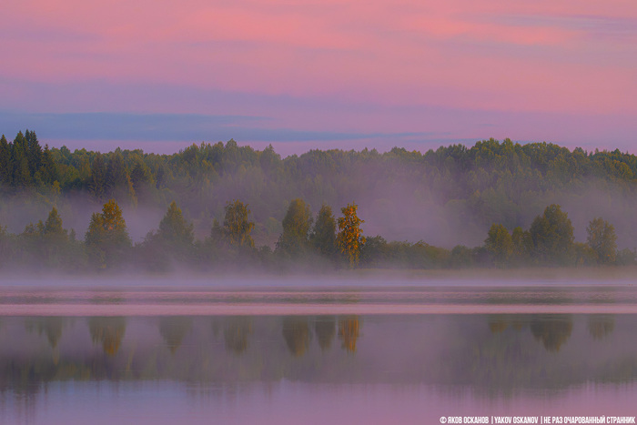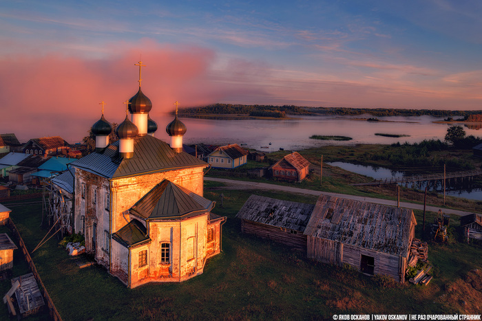 Рассвет поднялся над озером — медленный, мягкий. Вода лежала на пейзаже неподвижно, и плотный туман розовым облаком застыл над прибрежными кустами. Старая церковь с печатью давних лет на потрескавшихся стенах и потемневшими куполами встретила утро молчаливо.
