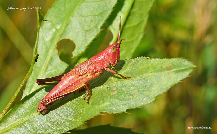 Теперь. собственно, почему он такой симпатичный? Нет, они не краснеют осенью как листья канадского клена. Хотя, это не точно, все возможно. Но, на самом деле это генетическая мутация, для которой характерно нарушение пигментации наружных покровов. По научному она называется эритризм. Эта мутация подавляет выработку нормального пигмента кузнечиков и повышает производство красного пигмента, в результате чего образуется его избыток. По сути, такие красные особи довольно хорошо заметны в траве и как правило они не доживают до взрослого состояния. Но, в конце лета, когда листья у растений меняют цвет и трава становится пожухлой, шансы таких кузнечиков на выживание увеличиваются, поскольку они становятся менее заметными.