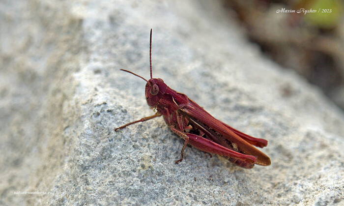 Ну и в заключении. Интересно, что подобная окраска встречается не только у зеленчука непарного (Chrysochraon dispar). Например, в конце августа прошлого года, во время прогулки мне удалось встретить конька обыкновенного (Chorthippus brunneus), который также был окрашен в красные цвета. К сожалению, удалось сделать всего одну фотографию.