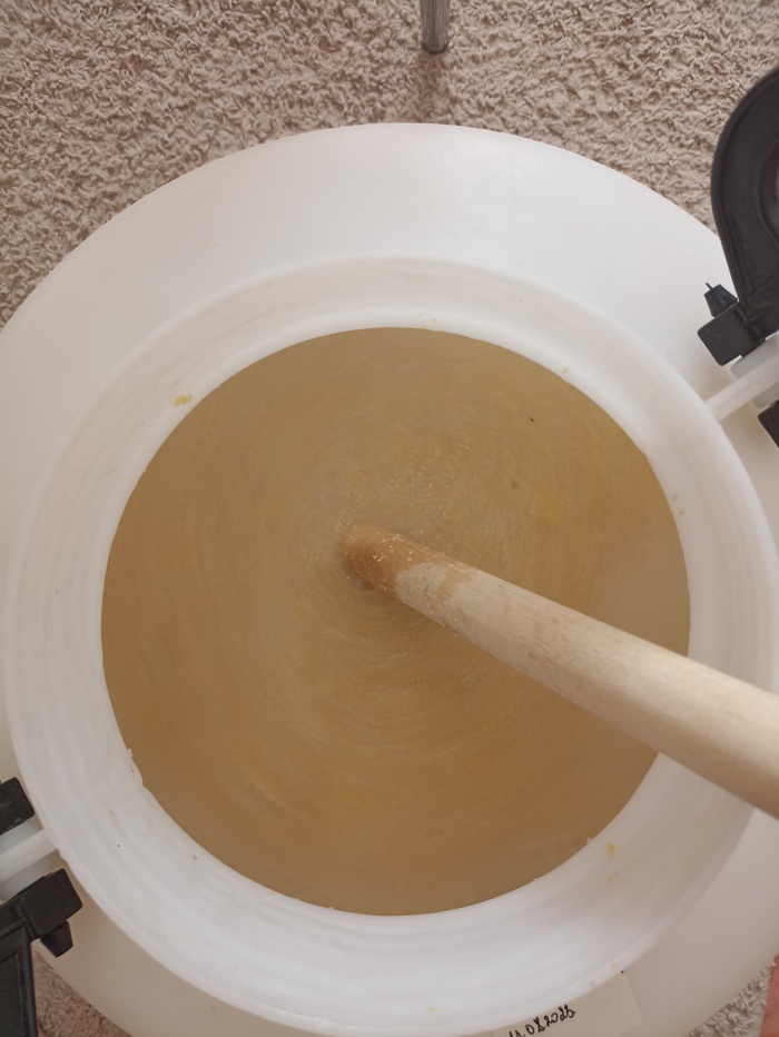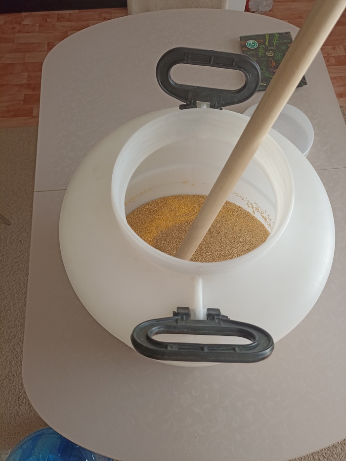 Тут в бочке каша))) как ее? Только ковшиком. Оказалось, что мой любимый двухлитровый ковш не лезет в горло фляги. Пришлось работать поллитровым. Ладно. Брага в кубе, ставлю греть потихоньку. Параллельно готовлю рпн.